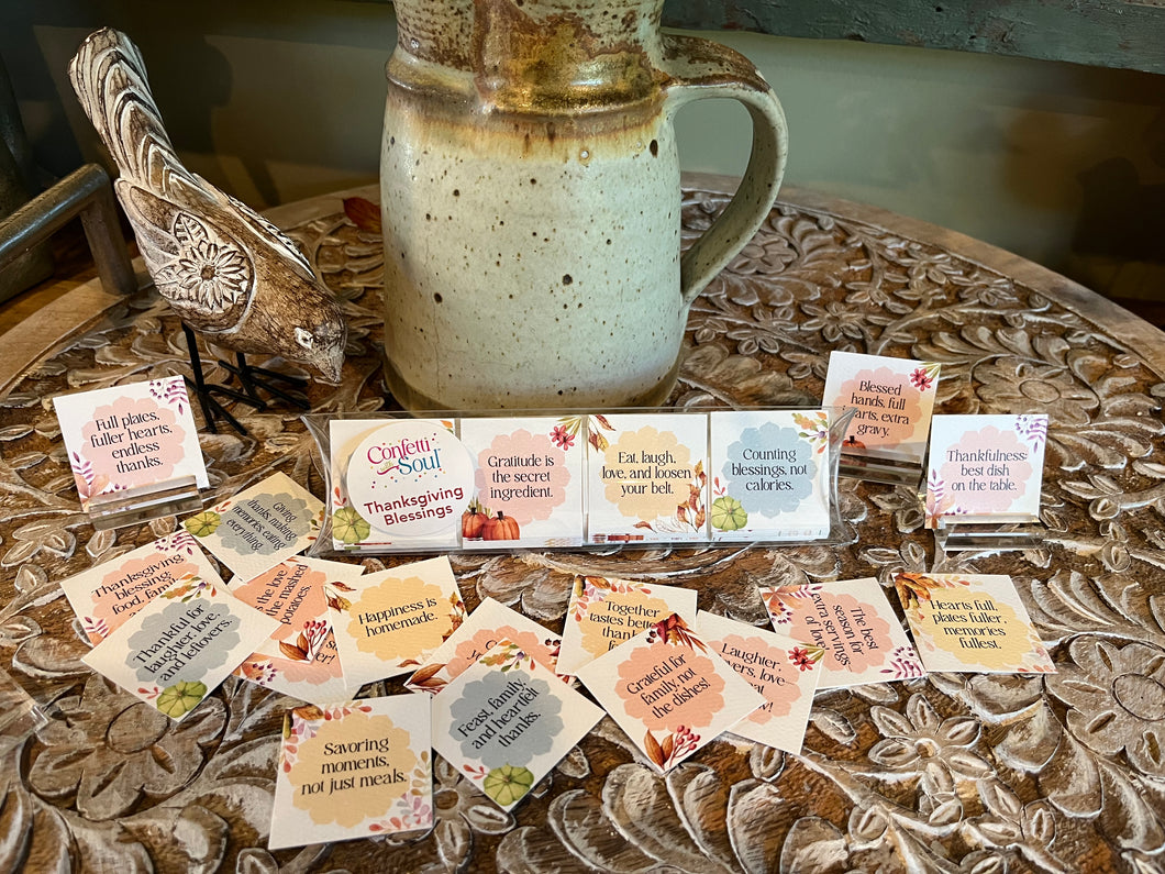 Inside are 36 messages to celebrate the season—honor blessings and savor togetherness. Scatter like autumn leaves on the table, tuck one into a pie box, or place one at each place setting to spark meaningful moments. Here’s a taste of what’s inside: